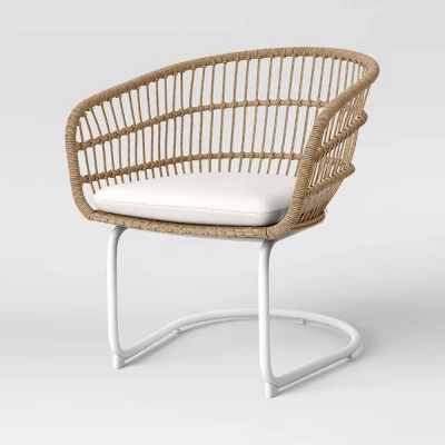 Chat over coffee with a friend with the Southport 3-Piece Motion Chat Set from Opalhouse™. This lovely patio furniture set comes with two armchairs with seat cushions and one accent table. The set perfectly accommodates two people and is great for entertaining guests or spending time with family. The pieces feature a white steel frame with beige wicker details that make for a chic and bold aesthetic. These classic colors match easily with any design themes you prefer. Pair with bright and bold colors for a playful space or with neutral colors for a space that is sleek, modern and calming. The rust-, water- and weather-resistant properties mean you can enjoy your outdoor space without worrying about maintenance.
